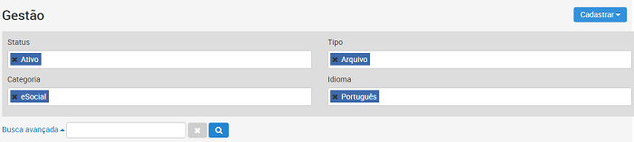 Para encontrar um conteúdo mais específico realize a Busca avançada, onde é possível selecionar os filtros: Status, Tipo, Categoria Única e Idioma.