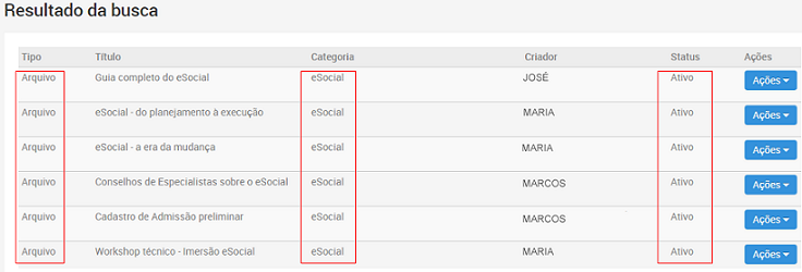 Ao localizar um artefato, é possível notar que o mesmo possui as informações: Tipo, Título, Categoria Única, Criador, Status e Ações. Tais informações denotam: