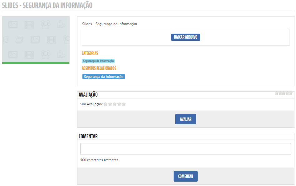 A opção Visualizar permite exibir o conteúdo selecionado. Nessa tela é possível observar as informações básicas de um conteúdo, assim como suas avaliações e comentários.