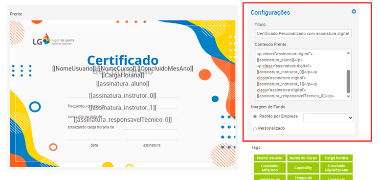 No campo Configurações, adicione os Signatários, e a posição onde cada signatário cadastrado irá assinar o certificado, fazendo-se necessário conhecimento em HTML para editar o conteúdo.