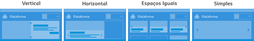 Indique nessa seção como o carrossel de destaques será apresentado, sendo possível as apresentá-lo de quatro maneiras: Vertical, Horizontal, Espaços Iguais, Simples. As maneiras Horizontal e Simples funcionam da mesma maneira, deslizando na horizontal , sendo que a primeira deixa um espaço livre ao lado à direita. Já na opção Espaços Iguais os destaques também se movimentam de maneira horizontal, mas dessa vez com múltiplos destaques ao invés de um só. A maneira Vertical exibe os destaques um a um deslizando verticalmente.