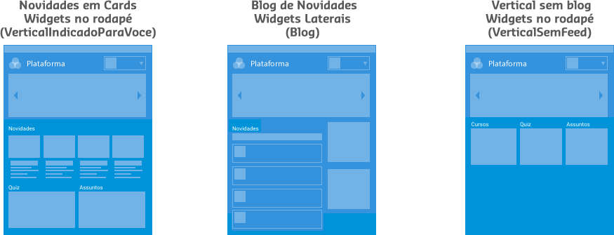 O formato da página home diz respeito à posição dos widgets e do bloco de novidades. Assim como os nomes sugerem, os layouts disponíveis são: Novidades em Cards e Widgets no rodapé, Blog de Novidades e Widgets Laterais, e Vertical sem blog e Widgets no rodapé.