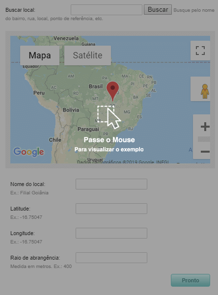 Para adicionar o local da marcação de ponto, primeiramente Busque o local desejado, informe o Nome do local e o Raio de abrangência em metros.