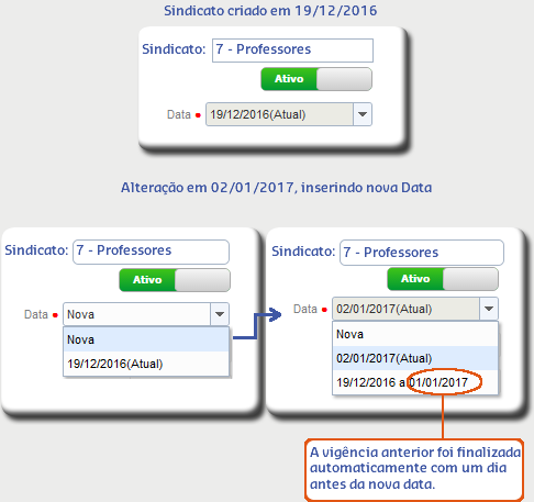 • Ao alterar algum dado do Sindicato e informar uma nova Data, inicia-se uma nova vigência encerrando a anterior.