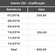 Considerando o evento 230 – Gratificação calculado na folha de pagamento mensal conforme abaixo: