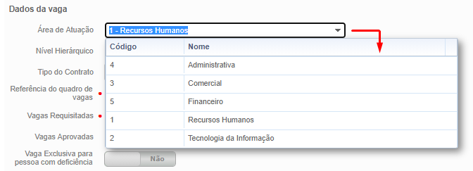 Área de Atuação - Indique qual será a área de atuação em que o candidato a vaga requisitada atuará;