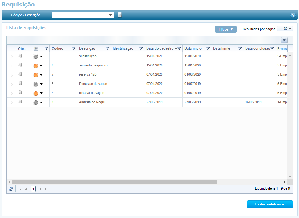 Através desta listagem são apresentadas todas as requisições já cadastradas, possibilitando agrupar, ordenar ou filtrar.