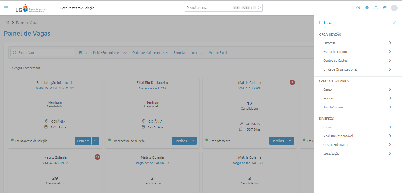 O Painel de Vagas tem como objetivo listar todas as Vagas em andamento do produto, considerando sempre a visibilidade no usuário logado. Nesse sentido, deve-se considerar que a Vaga agora representa a unificação de: