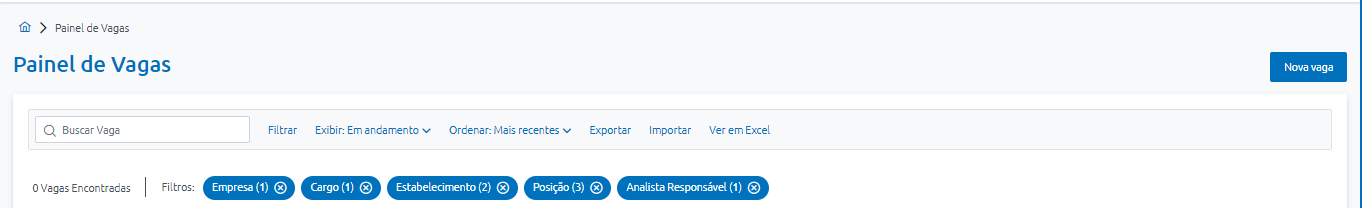 Após a aplicação dos filtros desejados, a tela de listagem de Vagas apresentará somente as Vagas que atendam a esses filtros, porém com os indicadores de filtros aplicados na tela.