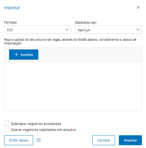 A seção Importar/ Exportar exportará tanto suas vagas desejadas pelo usuário, para fazer alterações pontuais em planilha, quanto também importará para fazer cadastro e alterações coletivas nas vagas.