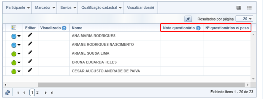 Assim que o candidato finalizar o Questionário, as notas serão apresentadas na coluna Nota Questionário da lista de candidatos, como também haverá a coluna N° questionários c/ peso que informará quantos questionários o candidato respondeu com peso. Caso as colunas relacionadas ao Questionário não estejam visíveis, clique com o botão direito do mouse sobre o cabeçalho da Lista de candidatos e marque as opções Nota questionário e N° questionários c/ peso para que dessa forma sejam incluídas na coluna da Lista.