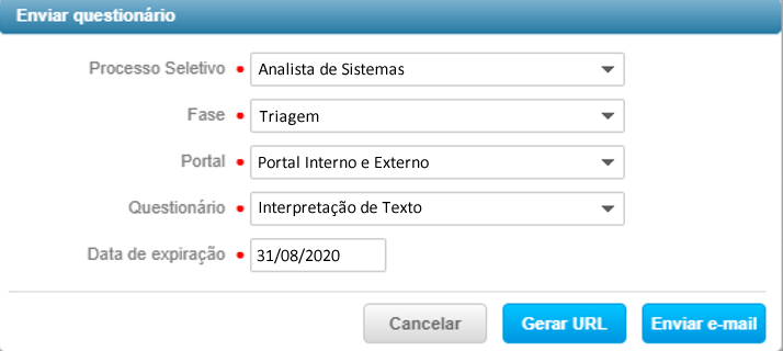 Para envio do Questionário escolha entre as opções Enviar E-mail e Gerar URL. Ao clicar em Enviar E-mail será possível na janela que surgir, selecionar o modelo de e-mail a ser enviado para os candidatos que receberão o Questionário. Já ao clicar na botão Gerar URL surgirá uma janela disponibilizando uma URL do questionário já autenticada, para que dessa forma o candidato que realizar o acesso pela URL não necessite executar alguma autenticação para responder o Questionário.