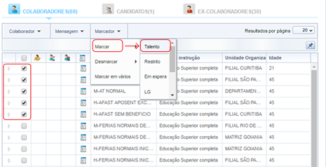 De acordo com a busca realizada será apresentada uma lista de pessoas que poderão participar das vagas, nas fases de Triagem ou Seleção. Através dessa lista é possível selecionar uma ou mais pessoas, marcando-as e executando as opções dispostas nos menus para colaboradores, candidatos e ex-colaboradores, como: visualizar currículo, inscrever na vaga, adicionar e removê-los dos marcadores Talento, Em espera e Restrito.