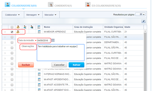 Outra maneira de inserir pessoas aos marcadores é através das colunas Talento, Em espera e Restrito na listagem de pessoas. Para isso clique sobre a coluna desejada e informe a Data da Inclusão e no campo Observações ou Motivo da restrição insira informações pertinentes a inserção à pasta.