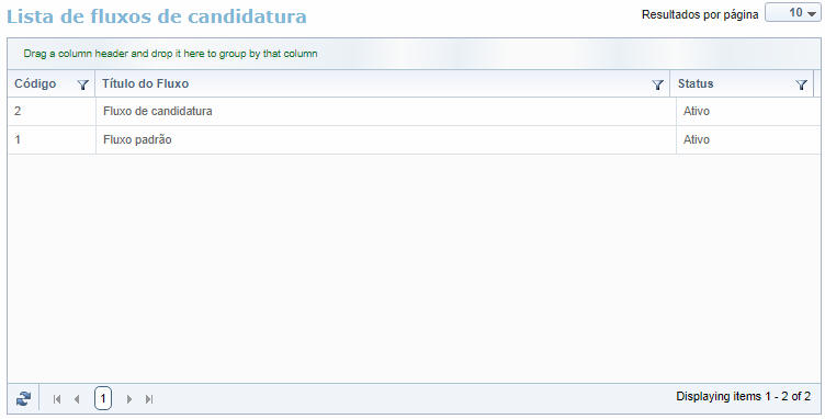 Ao abrir a tela, será apresentada a Lista dos fluxos de candidaturas cadastrados, possibilitando agrupar, ordenar ou filtrar. Para saber mais sobre a Lista de Informações, clique aqui.