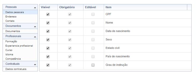 Através dessa funcionalidade é possível definir a visualização e edição de dados do Currículo do Colaborador.