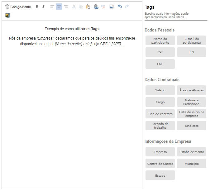 Através desta funcionalidade é possível criar e cadastrar modelos de carta oferta, que podem ser enviados a participantes que estejam na etapa de Seleção de um Processo Seletivo.