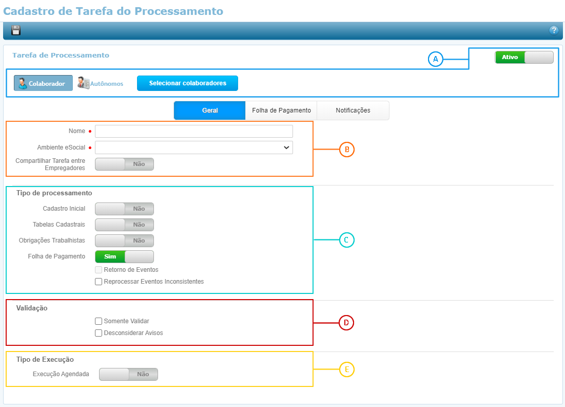 o Nome da tarefa e o Ambiente eSocial no qual a tarefa será processada, sendo possível