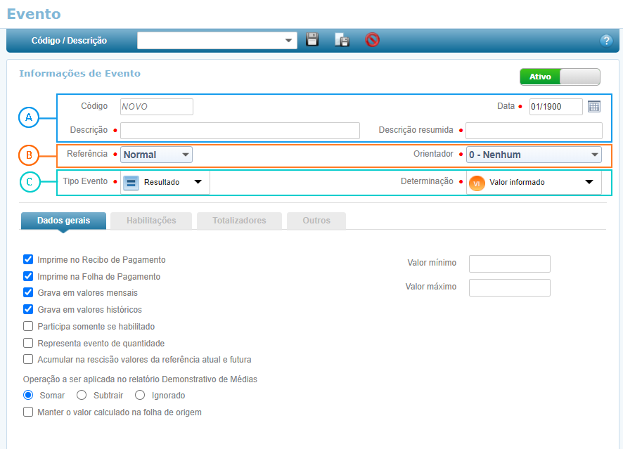 Nessa guia estão presentes vários indicadores que permitem imprimir o evento no Recibo de Pagamento, gravá-lo em valores históricos, dentre outros. A sua parametrização depende da necessidade e dos cenários avaliados pelo cliente, sendo que a sua marcação não influencia na realização dos pagamentos parcelados. Uma explicação detalhada desses indicadores se encontra na página Dados Gerais.