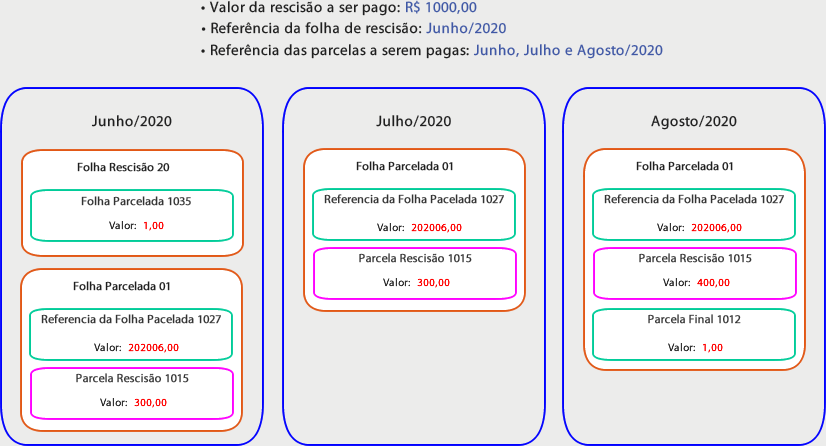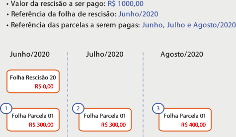 A Empresa XYZ decidiu parcelar a folha de rescisão da referência de junho do colaborador Reginaldo em 3 parcelas nos meses de junho, julho e agosto. Dessa maneira, para que seja possível fazer o parcelamento foram criadas a Folha Rescisão 20, do tipo Rescisão e a Folha Parcela 01 do tipo Outros, sendo a primeira folha a que foi parcelada, e a segunda a folha usada no pagamento das parcelas de junho, julho e agosto.