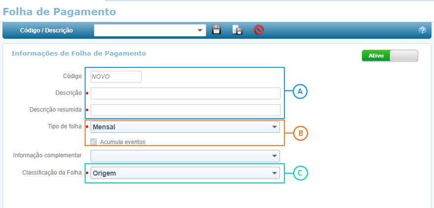 Já a folha usada para pagamento das parcelas deve ter o tipo Outros.