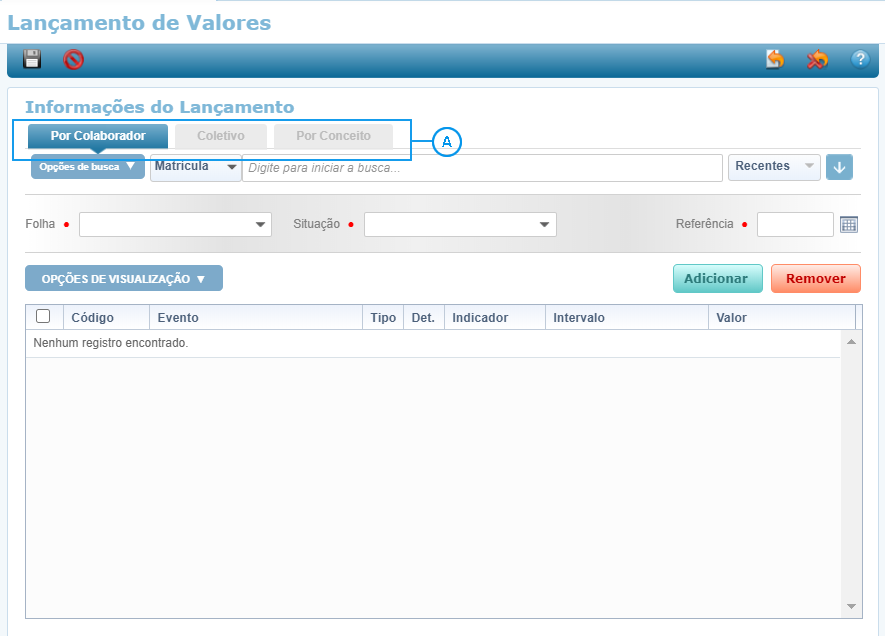 De acordo com a opção parametrizada, será necessário escolher um colaborador específico, um grupo de colaboradores ou um conceito sobre o qual o filtro de colaboradores incidirá. Informe em seguida a Folha, Situação e Referência na qual será lançado o evento. Escolha por fim o evento desejado e preencha os dados referentes ao lançamento.