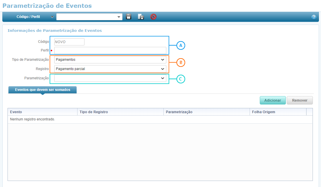 Com a Parametrização de Eventos completa, o próximo passo é atribuir valor aos eventos que devem ser calculados de modo que, ao verificar que esses eventos foram calculados, o sistema poderá identificar os dados dos Eventos e da Parametrização de Eventos para fazer a geração correta do arquivo S-1210 após a finalização dos pagamentos parcelados.