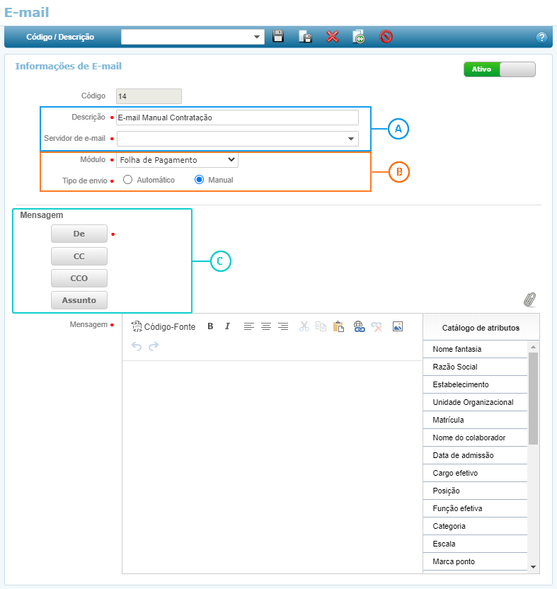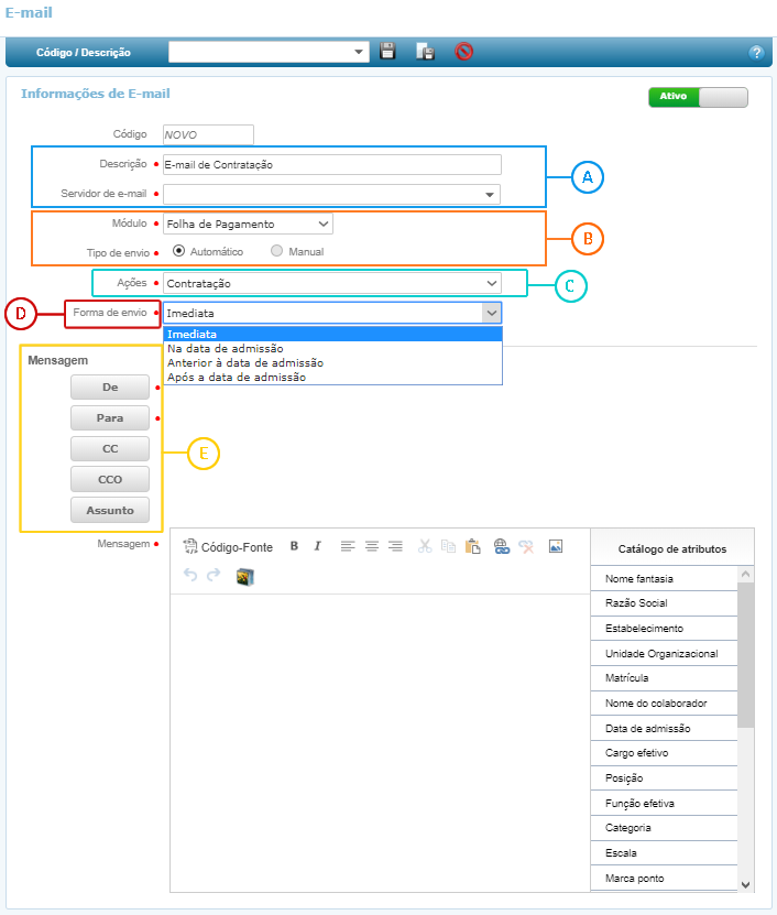 Por fim, elabore no campo Mensagem o corpo do E-mail com o texto desejado, utilize também se necessário, o Catálogo de atributos para preencher o corpo do texto com alguma informação específica.