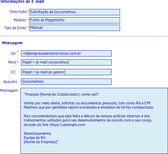 O e-mail cadastrado como Tipo de Envio - Manual para Folha de Pagamento será enviado através da funcionalidade Contratação, confira os passos a seguir no item 3.3. Parametrizações na funcionalidade Contratação do Tutorial.