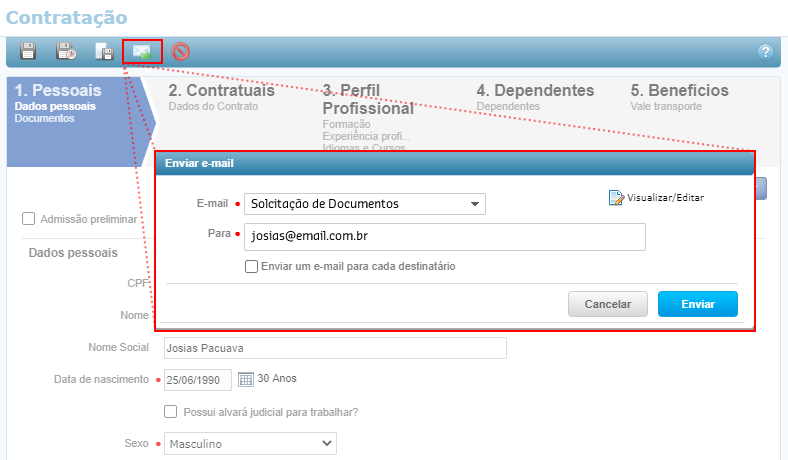 de contratação do colaborador. Ao clicar no botão, surgirá a janela Enviar e-mail, nela você