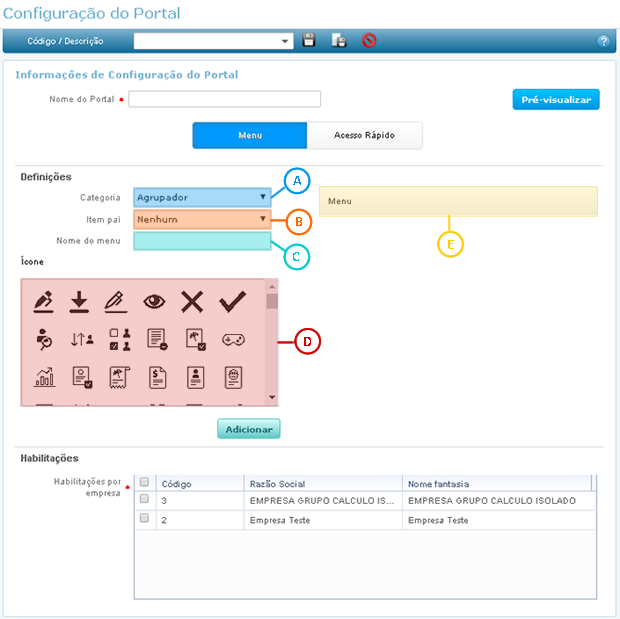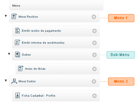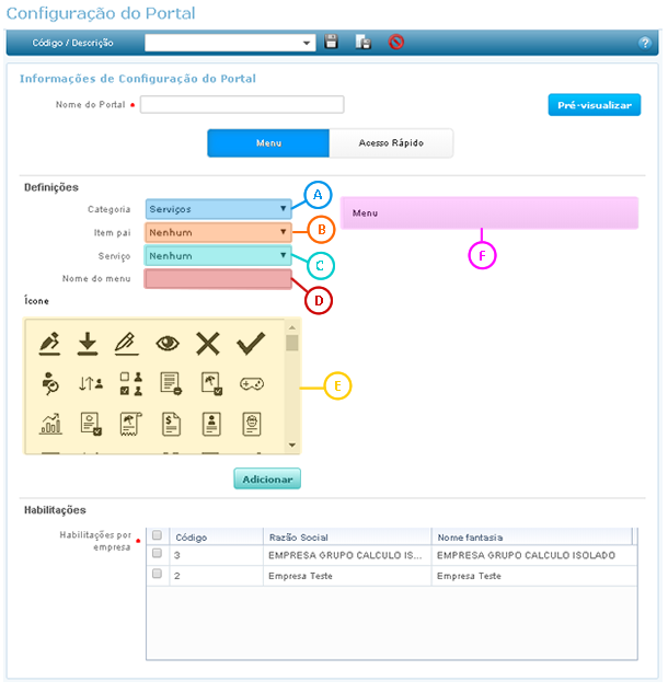 Através dessa guia é possível personalizar o Menu do portal do autoatendimento, informando os serviços do menu e ícones para cada um deles.