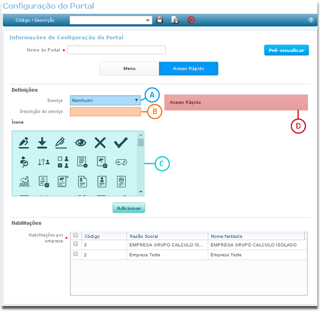 Nesta guia é possível configurar o Acesso Rápido personalizando atalhos que serão apresentados na home do portal do autoatendimento.