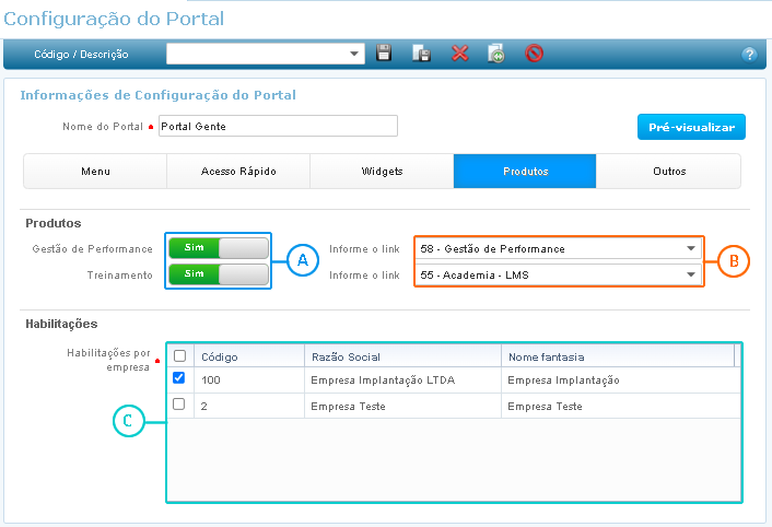 Através dessa guia é possível definir quais os produtos serão apresentados no menu do Portal de Autoatendimento.