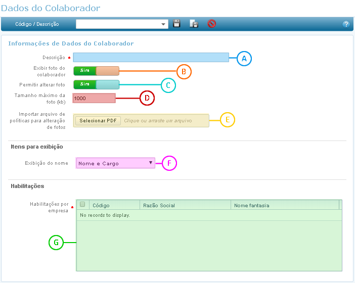 Para gravar, excluir e cancelar a configuração dos dados do colaborador, clique sobre os botões (Salvar), (Excluir) e (Cancelar), respectivamente.