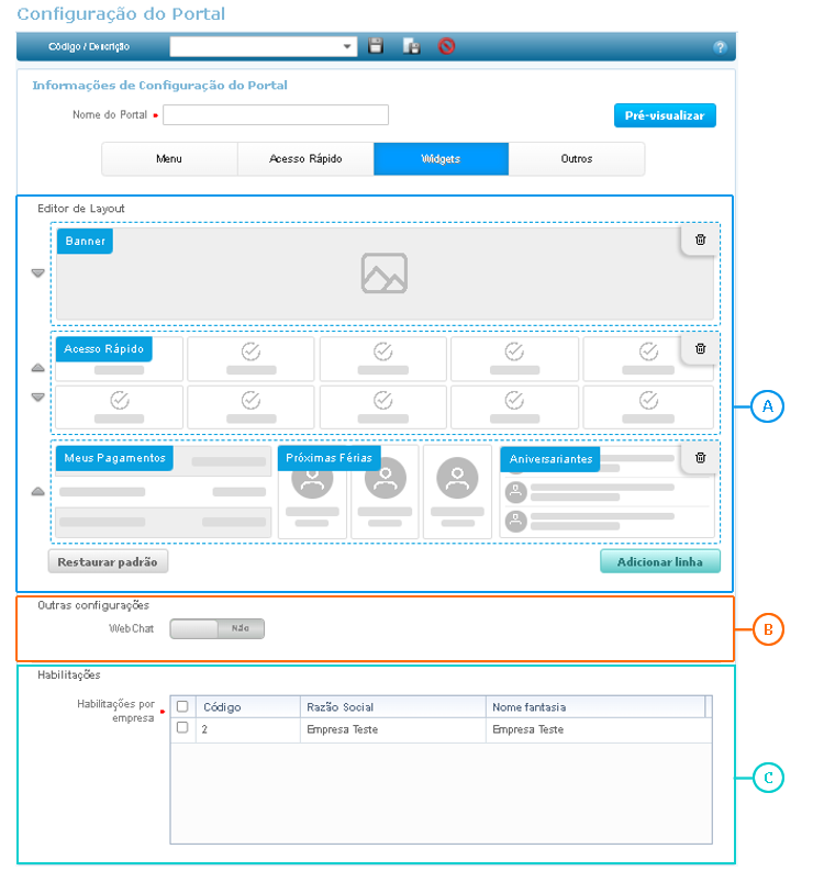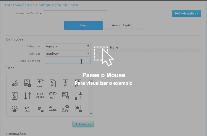 As configurações do portal são divididas em:Menu, Acesso Rápido, Widgets, Produtos e Outros.