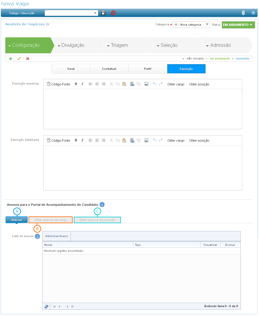 Acesse a funcionalidade Painel de Vagas (Caminho da Suíte Gen.te Recrutamento e Seleção > Menu > Painel de Vagas > Detalhes > guia Configuração > subguia Descrição).
