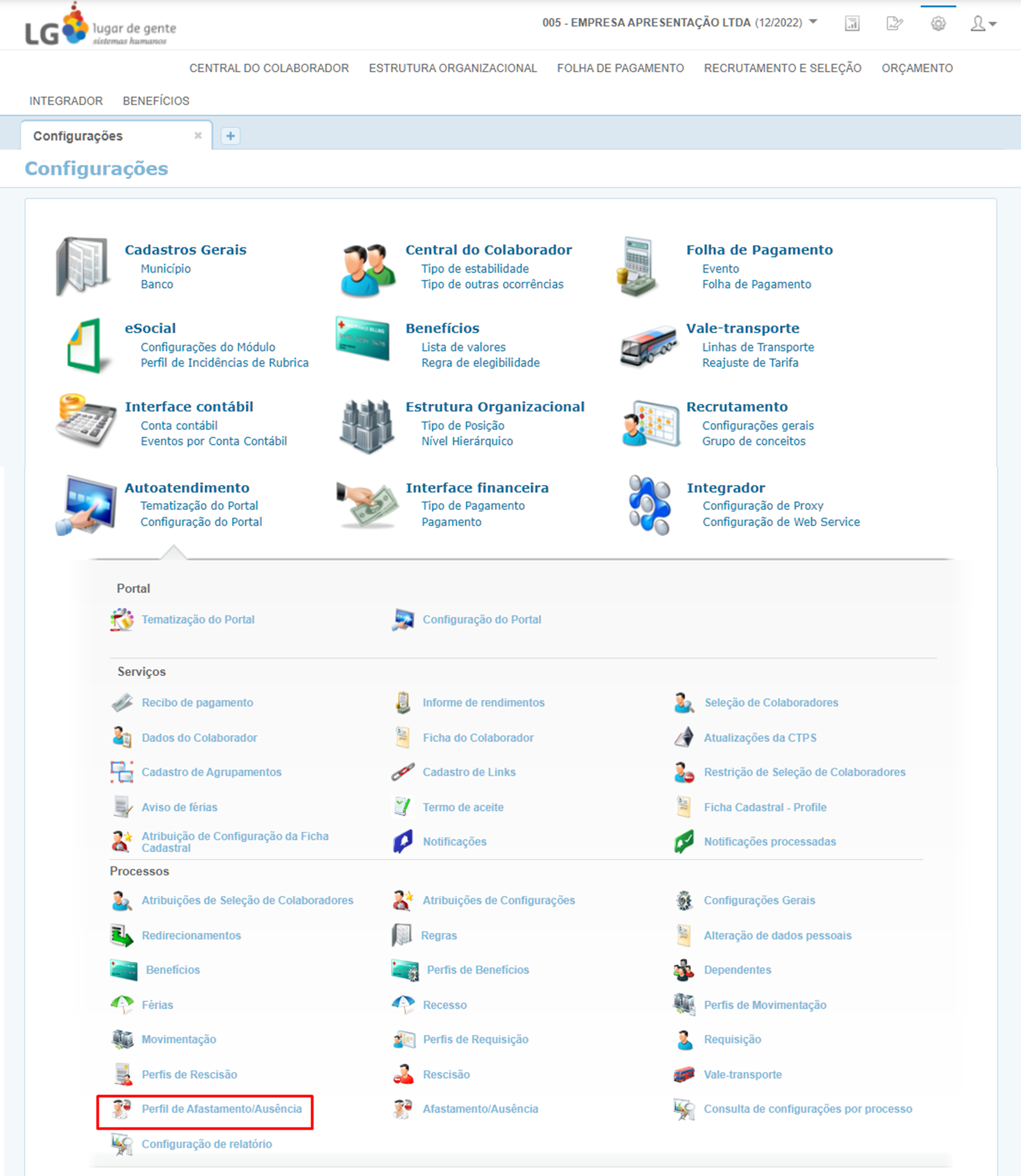 Acesse em Configurações Gerais a funcionalidade Autoatendimento (Caminho pela Suíte Gen.te: Menu Configurações > Autoatendimento > guia Processos > Perfil de Afastamento/Ausência).