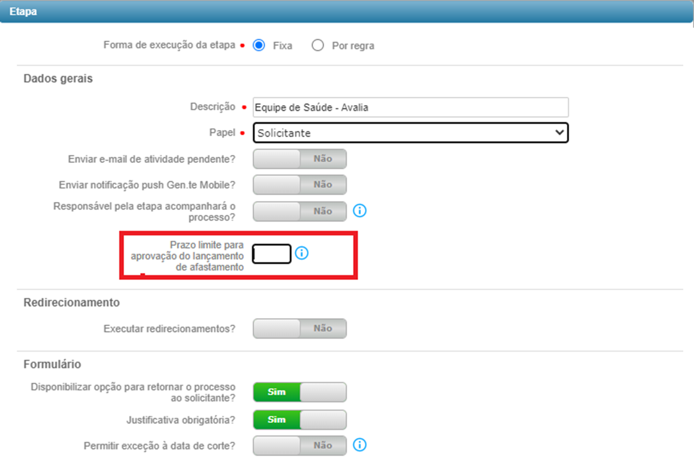 Será aberta a guia Etapas, onde dentro do campo Dados Gerais conterá o indicador Prazo limite para aprovação do lançamento de afastamento. Nesta opção, será necessário informar os dias para a aprovação do lançamento do afastamento, sendo esses contados a partir da data do afastamento.