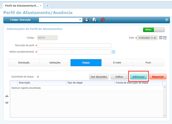 Em Informações de Perfil de Afastamento, selecione a guia Etapas, e clique no botão .