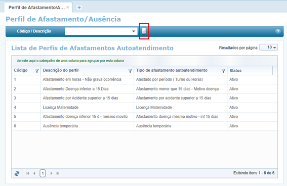 Ao acessar a funcionalidade Perfil de Afastamento/Ausência, clique no botão para iniciar um novo cadastro.