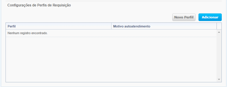 Na seção Configurações de Perfis de Requisição são disponibilizados os perfis que foram previamente cadastrados através da funcionalidade Perfis de Requisição. Para atribuir uma configuração à um perfil, clique em , associe o perfil desejado e clique em .