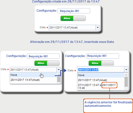Ao alterar algum dado da configuração e informar uma nova Data, inicia-se uma nova vigência encerrando a anterior.