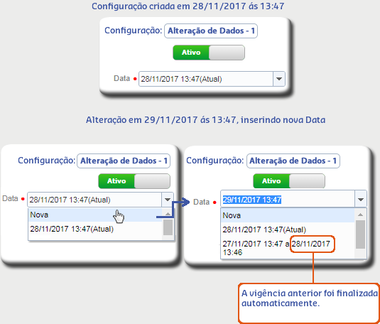 Se uma nova Data não for informada, os dados alterados serão considerados como se fizessem parte da configuração desde a sua criação.
