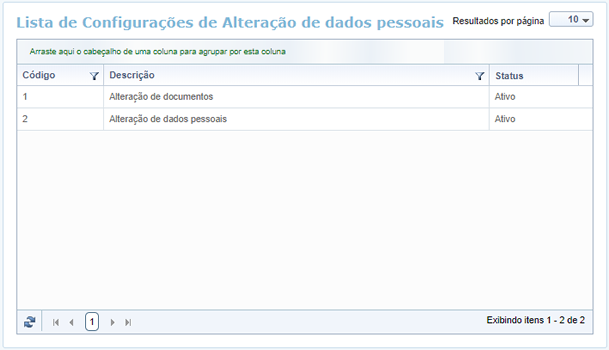 Ao abrir essa funcionalidade, é apresentada uma relação das Configurações de Alteração de dados pessoais já cadastradas: