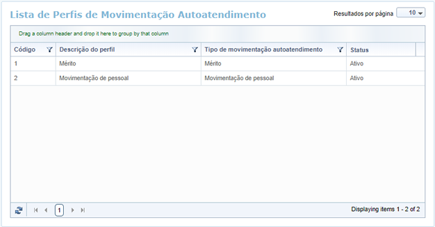 Ao abrir essa funcionalidade, é apresentada uma relação das Configurações de Perfis de Movimentação já cadastradas: