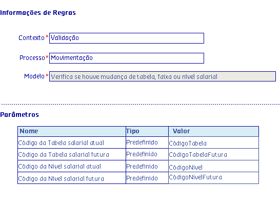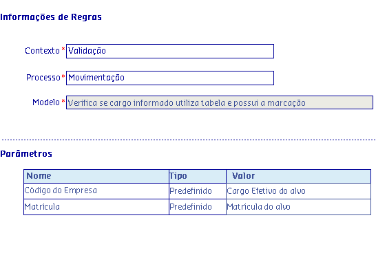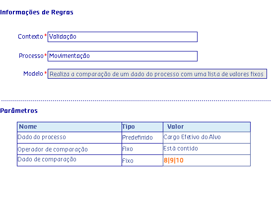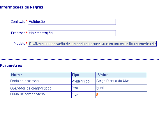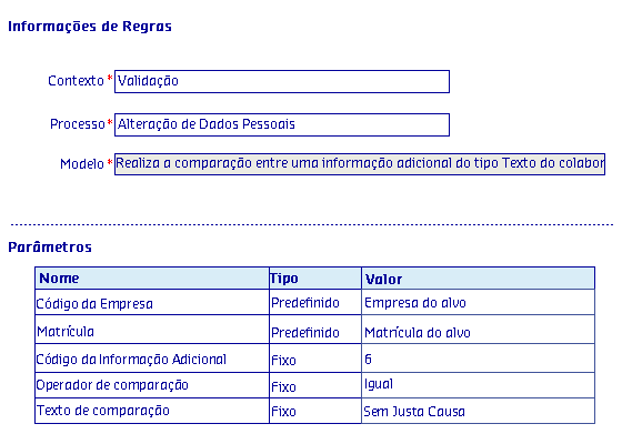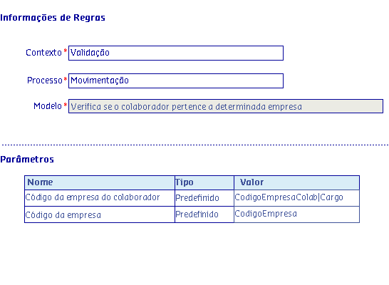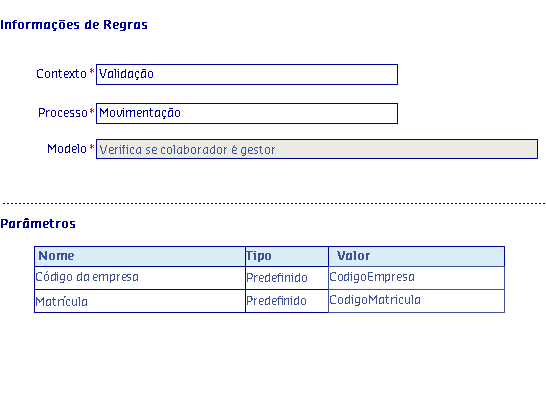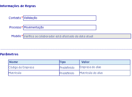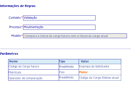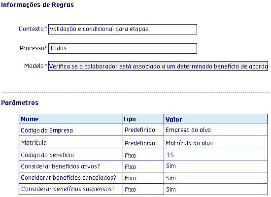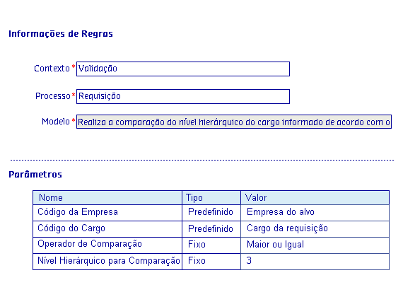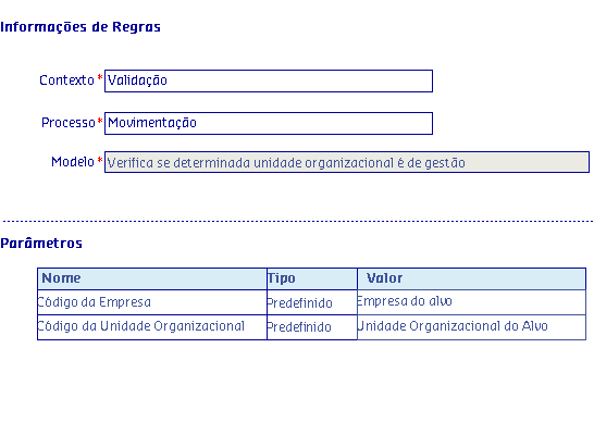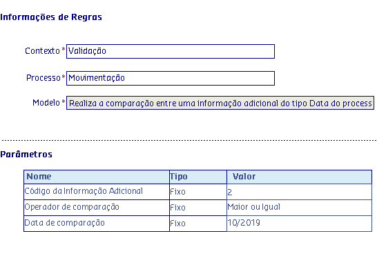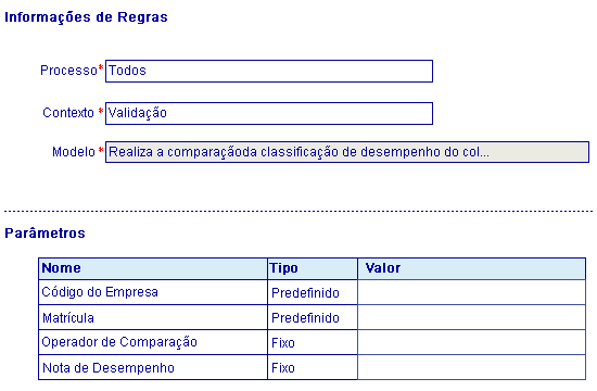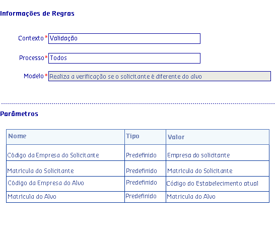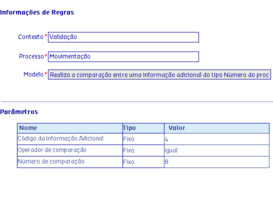 Os Modelos de regras, são disponibilizados de acordo com o Processo selecionado, onde serão apresentadas as informações da Regra, possibilitando parametrizar os critérios utilizados pela regra para serem aplicados no processo.