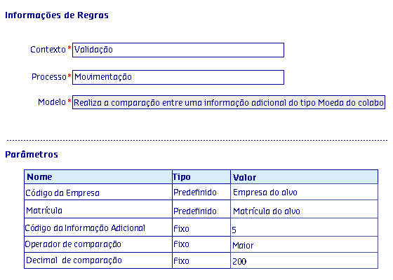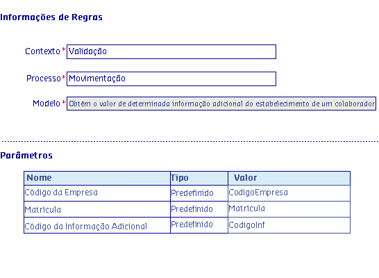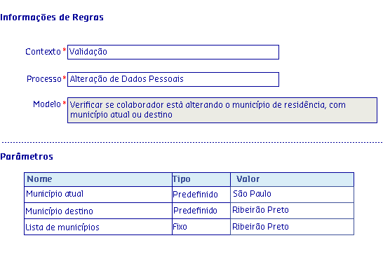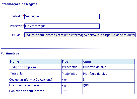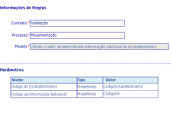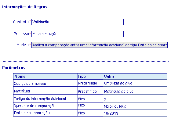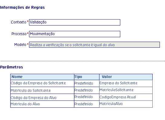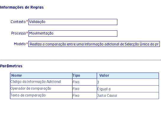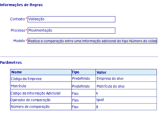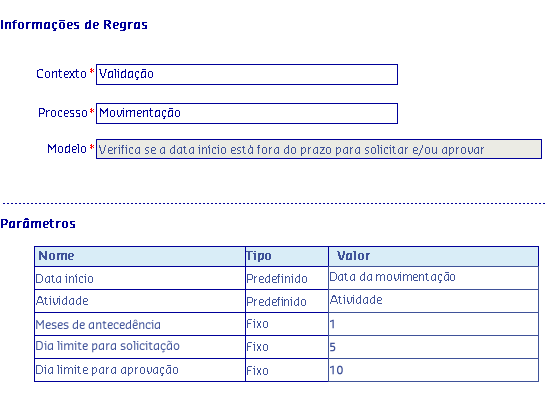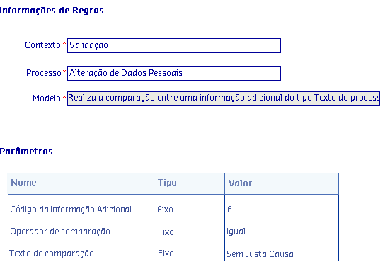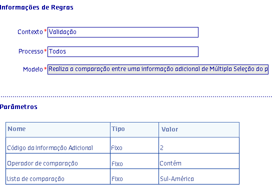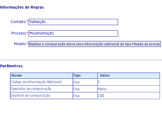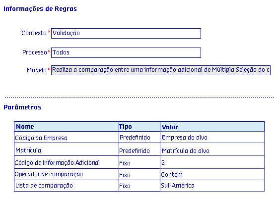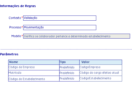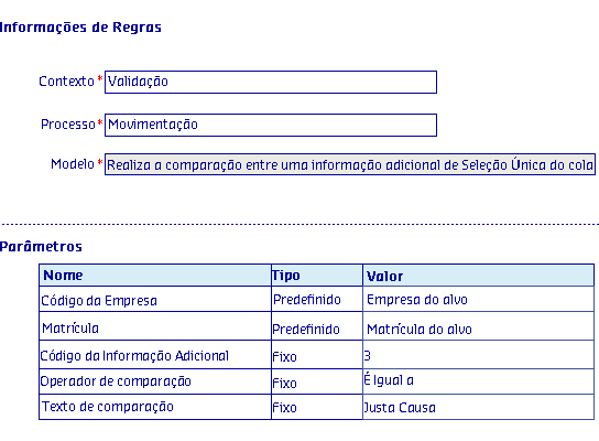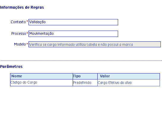 Os Modelos de regras, são disponibilizados de acordo com o Processo selecionado, onde serão apresentadas as informações da Regra, possibilitando parametrizar os critérios utilizados pela regra para serem aplicados no processo.