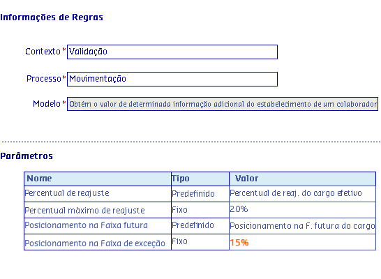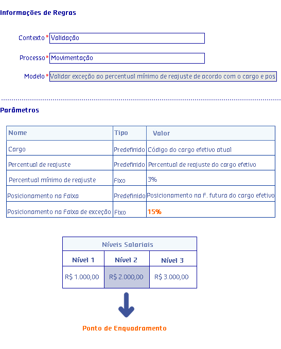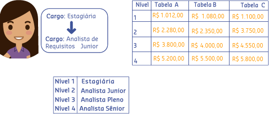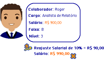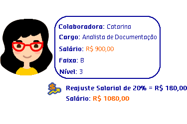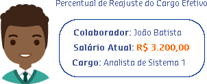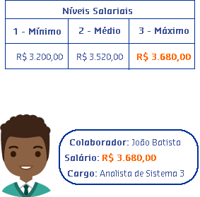 João Carlos atualmente é Analista de Suporte Nível 2. A Gestora Clara, após ver tamanho comprometimento de João Carlos perante seu trabalho na empresa, decidiu mudá-lo de nível salarial. Como a solicitação foi para um perfil que usava a regra Verifica se o posicionamento na faixa é maior que determinado limite, Clara percebeu que se mudasse João Carlos para Analista de Suporte Nível 3, o reajuste salarial ultrapassaria 120% e isso a empresa não permite. Para mostrar seu contentamento com o trabalho do colaborador, Carla decidiu então mudá-lo da Faixa A para a Faixa B. O reajuste de mudança de faixa ficou abaixo dos 120% e João Carlos teve o reconhecimento pelo seu trabalho.