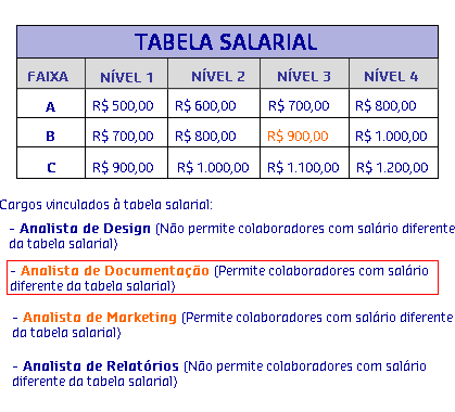 Através do modelo Verifica se cargo informado utiliza tabela e não possui a marcação "Permitir colaboradores com salário diferente da tabela salarial", é possível verificar se para um determinado cargo não é permitido realizar reajuste para colaboradores com valores diferente da tabela salarial.