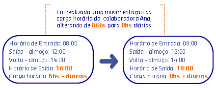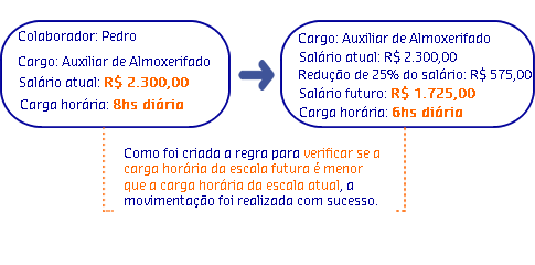Maria está trabalhando 35 horas semanais atualmente e solicitou uma movimentação para uma escala de 40 horas semanais. No processo, foi parametrizado a regra para o contexto de Validação utilizando o operador "Maior". Com isso, foi permitida a solicitação da Maria pois sua carga horária da escala futura é maior que a carga horária da sua escala atual.